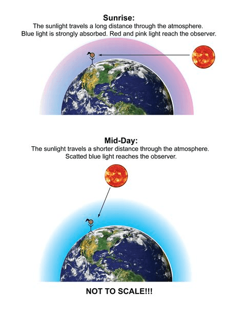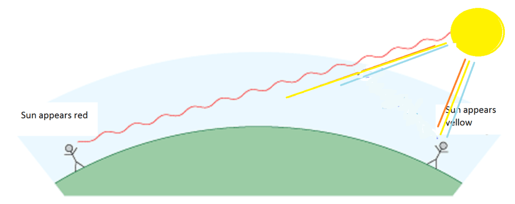 Saat Matahari berada di dekat cakrawala, cahaya harus melewati lapisan atmosfer yang lebih tebal. Cahaya biru tersebar ke segala arah, sementara cahaya merah mendominasi pandangan.